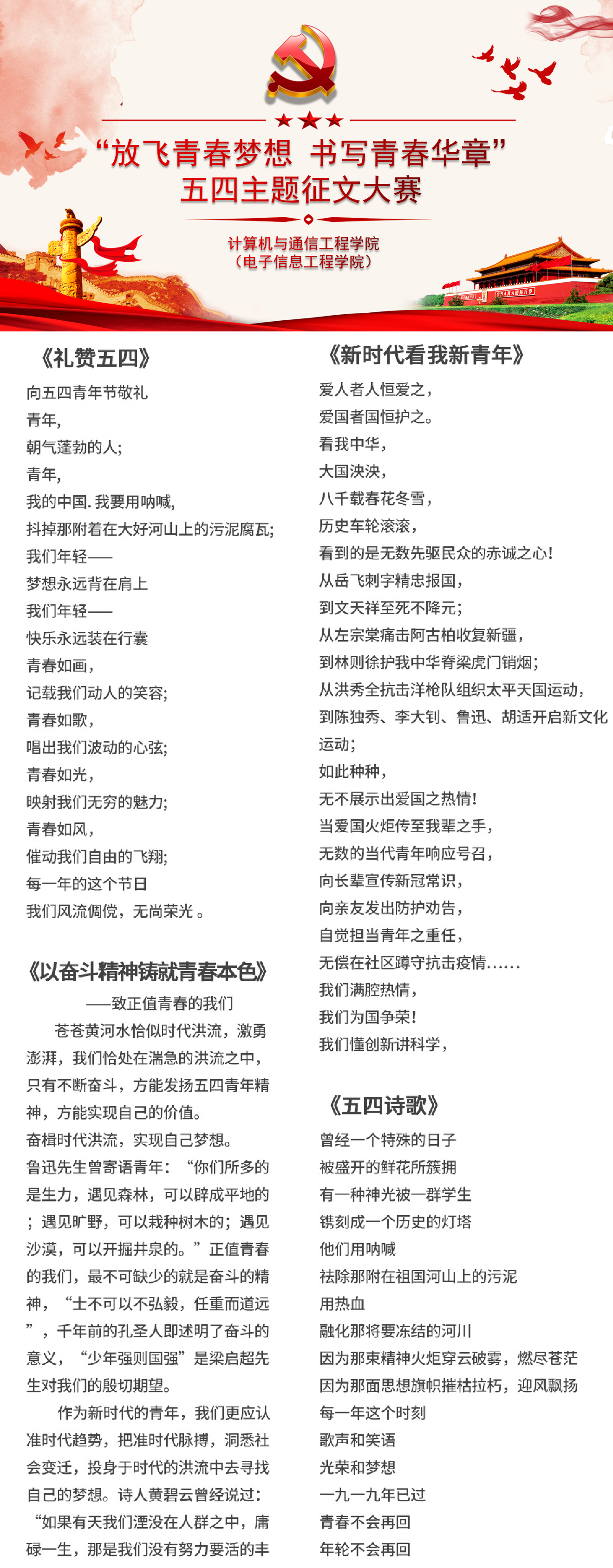 为缅怀五四先驱崇高的爱国情怀,弘扬“爱国、进步、民主、科学”的五四精神,计算机与通信工程学院(电子信息工程学院)于五四运动101周年之际举办了“放飞青春梦想,书写青春华章”五四主题征文大赛。