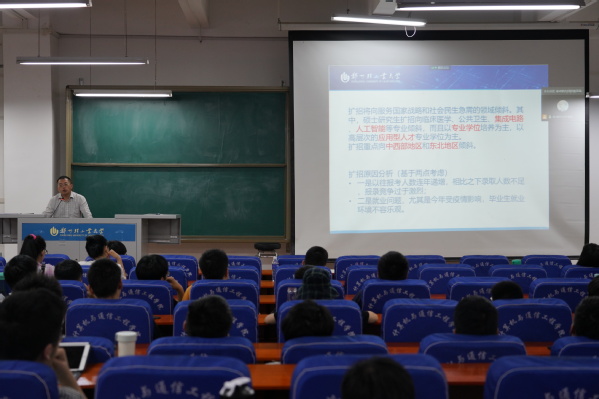 朱院长首先对近10年的考研数据进行分析,解读了近年研究生招生政策的变化。也从我院的专业角度出发,明确指出了我院学生面临的考研形势、专业课考试内容、如何选择报考学校以及报名过程中的注意事项等问题。随后,朱院长对我院学科建设、研究生培养、研究生招生计划和学科团队进行了详细讲解。最后朱院长对同学们提出了三点期望:一是要心无旁骛,保持良好心态,端正复习态度,持之以恒备考;二是要准确定位,结合自身实力状态理性选择报考院校和专业;三是要保证信息的畅通,准确掌握报考院校和专业具体要求,做到有的放矢。