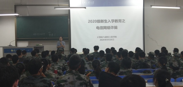 2020年9月26日,计算机与通信工程学院在计算机楼217组织开展了“防范电信诈骗”新生教育讲座,计算机与通信工程学院全体2020级新生参加了此次活动。