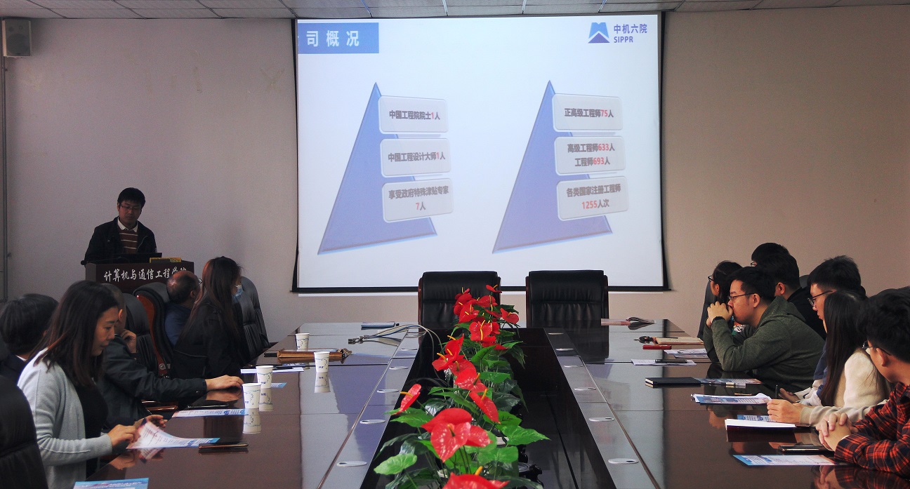 2020年11月2日,计算机与通信工程学院在计算机楼213会议室举办2021届硕士毕业生校园招聘宣讲会。由中国机械工业第六设计研究院有限公司王更书记亲自带队来我校进行2021届硕士毕业生校园招聘宣讲,研究生辅导员赵进超老师、杨静老师以及2018级全体研究生参加了此次招聘宣讲会。