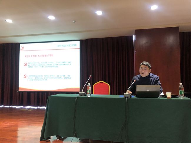 马克思主义学院党总支书记马寒以《加强支部建设 夯实组织基础》为题,逐条解读了《中国共产党支部工作条例(试行)》。他从党支部的功能定位以及遵循原则;党支部的设置有哪些规定;党支部的基本任务和不同领域党支部的重点任务是什么;党支部有哪些工作机制;党支部如何开展组织生活;党支部委员会建设有哪些具体要求;如何对党支部工作进行领导、提供保障等七个方面讲解了《中国共产党支部工作条例(试行)》制定的时代背景和重要意义,并就基层党组织如何开展具体业务工作,如何建设守信念、讲奉献、有本领、重品行的基层党组织带头人队伍进行了阐述。