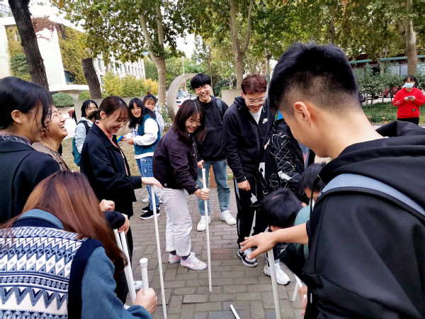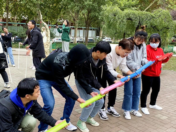 “快乐的一天”是以舒缓情绪、增进友情为目的的素质拓展活动,此次活动共有三个环节,分别为同心鼓、高山流水和不倒森林。在“同心鼓”游戏环节中,同学们每人握住同心鼓的一根绳子并将绳子拉紧,一个人扔球大家用鼓来接,同学们必须齐心协力才能用绳子控制同心鼓的方向以及接球的力度,在经过几次失败后,大家逐渐掌握了技巧并最终获得了成功,同学们积极参与,现场气氛热烈。在“高山流水”游戏环节中,同学们被随机分成两组,组员们用乒乓球模拟流水,依次用工具接球,两组同学配合默契,现场笑声不断。在最后进行的“不倒森林”游戏环节,同学们在班委的引导下围成一个圈,一人手握一根棍子模拟森林,传递棍子期间要保证棍子不能倒下,当转完一圈重新回到原点即为成功,大家互相配合,团队协作。游戏结束后,大家合影留念,记录下这富有意义的时刻。