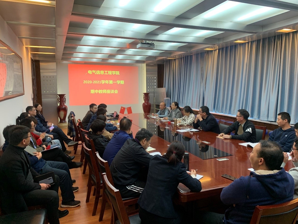 2020年11月19日下午15:30,电气信息工程学院在西二楼301室召开了2020-2021学年第一学期期中教师座谈会,院领导班子成员、各专业负责人、课程组组长、督导组组长、学生工作负责人及教师代表30余人参加了座谈会,会议由副院长郑安平主持。