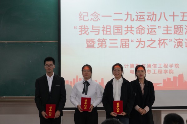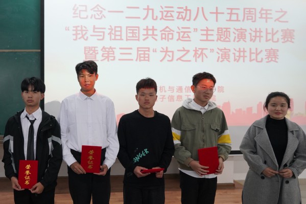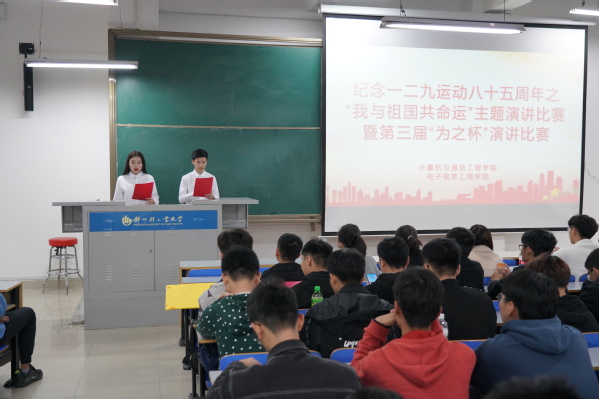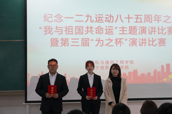 11月26日,计算机与通信工程学院(电子信息工程学院)于计算机楼118举办纪念一二·九运动85周年系列活动之“我与祖国共命运”主题演讲比赛,本次比赛由学院专职辅导员、演讲与口才协会优秀同学担任评委,20级各班选手代表参加。