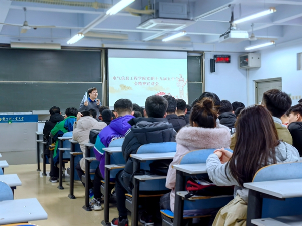 12月9日晚7点,电气信息工程学院在教三楼804举办党的十九届五中全会精神宣讲会,会议由校团委副书记、青年讲师团成员王银峰主讲,学院二级青马培训班全体同学、各年级学生代表参与讲座。