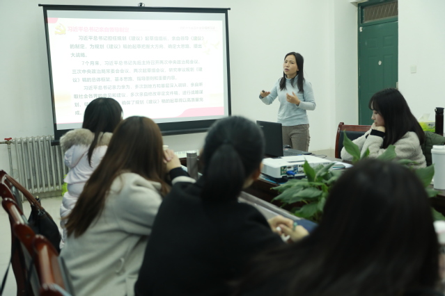 郭静老师带领大家一起学习了十九届五中全会的主要内容,结合全会提出的重要思想、重要论断和重要举措谈了自己的心得体会。同时指出党的十九届五中全会具有重大历史性、鲜明时代性和重要全局性,希望大家认真学习领会全会精神,提高思想认识,坚定理想信念,努力学习党的理论知识,不断提高本领才干。