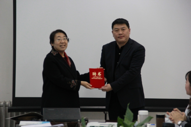 院长闻英代表学院为四通集团董事长张春华颁发特邀研究员聘书。