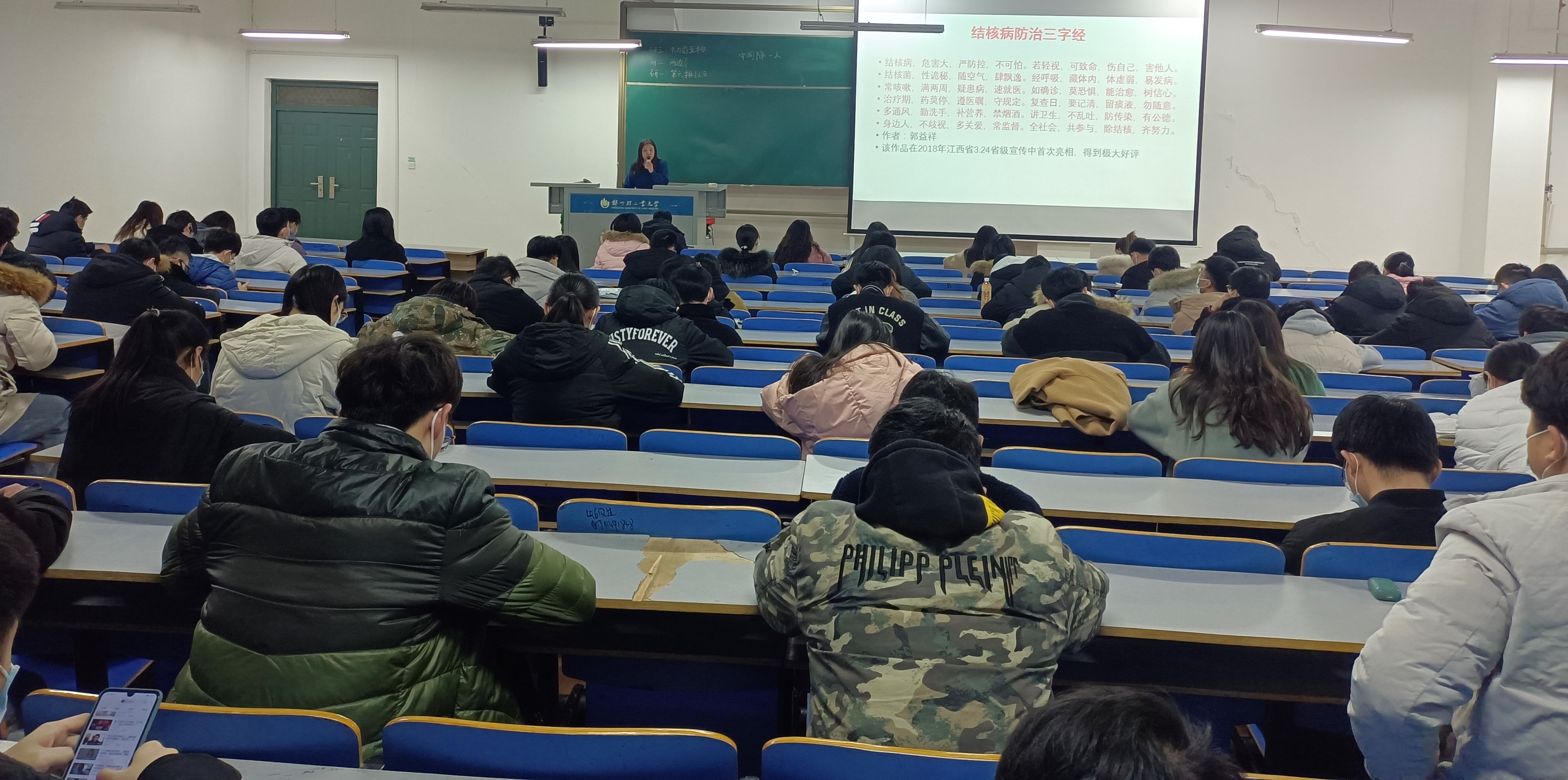 郭莉老师分别讲解了水痘、肺结核病等常见传染病以及当前的新冠肺炎相关基础知识,尤其是当前处于寒冬季节,结核病和新冠肺炎处于高发期,郭老师教授学生正确识别这些传染病的发病概况和特征、传播途径等相关知识及防治办法和策略。嘱托同学们平时务必注意个人卫生,养成良好的生活习惯,不随地吐痰,在宿舍和学习工作区,要经常开窗通风,保持室内空气流通、新鲜,进行适当的户外活动和体育锻炼,增强体质,提高个体抵抗力和免疫力。同学们都认真听讲,积极互动,最后报告会在同学们的热烈掌声中落幕。