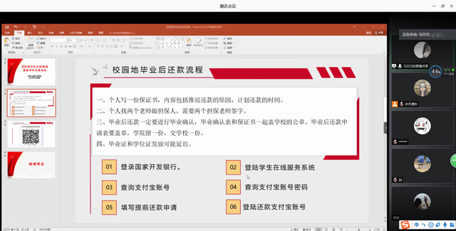 马老师详细讲解了国家助学贷款还款流程及征信系统,就国家助学贷款的相关政策、还款方式、支付宝还款操作等方面做了详细介绍;建议未还款同学按时、按量还款,提醒贷款毕业生毕业后的还息时间及流程。最后,王艳军书记号召全体贷款毕业生按时还本付息,恪守诚信、知恩感恩,做一个既对自己负责,又对社会负责的人,让诚信和感恩伴随自己奔向辉煌前程,传递爱、延续爱。