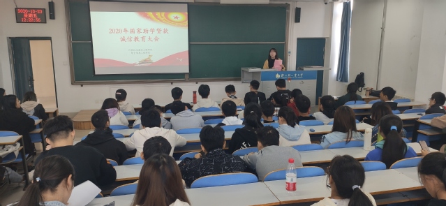2020年11月9日中午,计算机与通信工程学院(电子信息工程学院)在计算机楼217室召开2020年国家助学贷款合同签订暨诚信教育大会,负责资助工作的马贝贝老师和申请2020年高校助学贷款的300余名学生参加了此次大会。