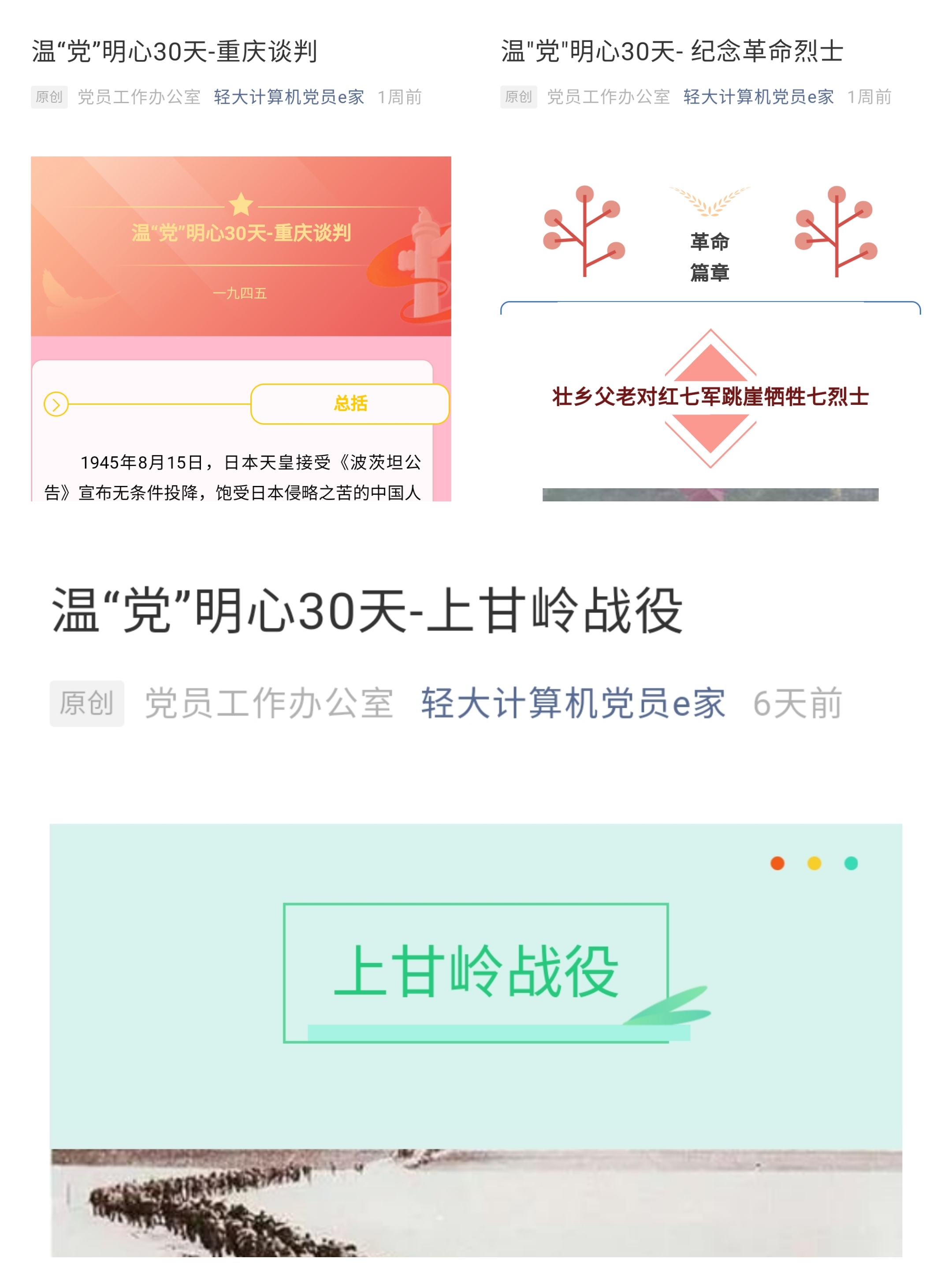 本次活动通过微信公众号来发布党史故事供学生浏览学习。推文中主要向同学们讲述了在跨过鸭绿江、中共一大、上甘岭战役、长征等重大事件中涌现出的一大批视死如归、顽强奋斗的革命烈士的感人故事,他们在党的正确指引下,用鲜血换来了我们今天的新中国。同学们在阅读后纷纷表示要将发扬党的光荣传统,传承党的红色基因,开创祖国更加美好的未来。