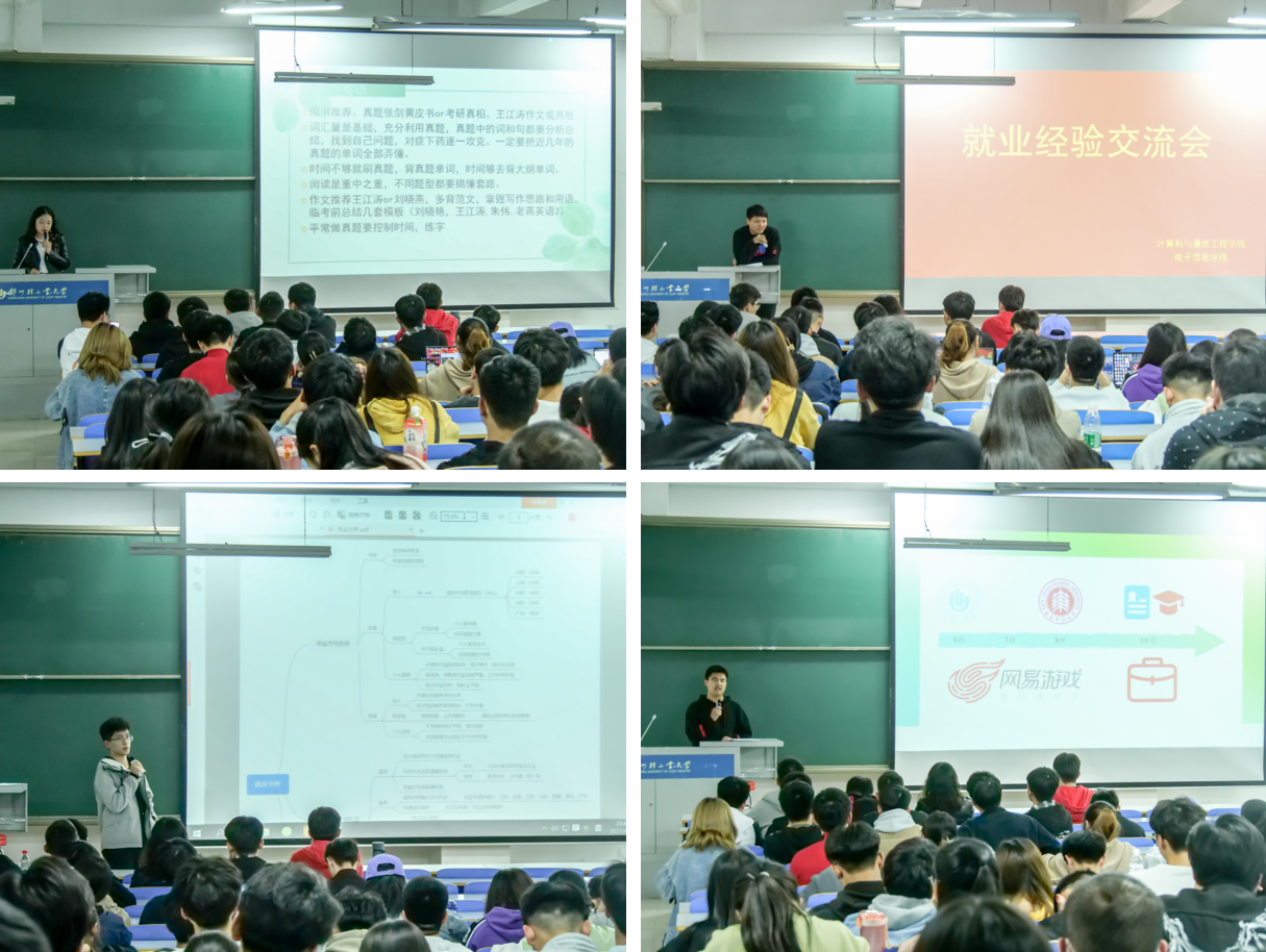 首先,已被首都经济贸易大学拟录取的张飞燕同学从高数、英语、政治、专业课、复试和考试心态六个角度分享了她备战考研的经验和学习总结,同时也推荐了相关辅导资料、网课资源和各类相关的微信公众号,给同学们提供了许多有益的建议。被中国建设银行拟录用的杨文振同学结合他自己的求职经历和经验与同学们分享了如何解决求职银行过程中会遇到的问题,以及参加银行考试中的技巧和建议,并鼓励同学们端正学习态度,提高学习水平和工作能力。考上教育部民族教育中心的舒海威同学分别从就业方向选择、考编机会、考编中可能会遇到的问题以及备考范围四个方面给同学们做了详细的分享,让同学们了解到了就业的多样性,他鼓励同学们多去尝试,这样选择的机会才会更多,并希望同学们珍惜现在的时光努力学习,为将来的好工作打下坚实的基础。现就职于网易(杭州)网络公司的陈留阳同学用自己的亲身经历从“如何找到适合自己的发展平台”、“如何做好就业准备”“自己的职业规划”给大家分享了自己的心路历程,他鼓励同学们要参与项目和学科竞赛,提高自己的专业能力。之后同学们也积极提出自己对于就业的疑惑和问题,学长学姐们从他们的实战经验出发做出了解答。