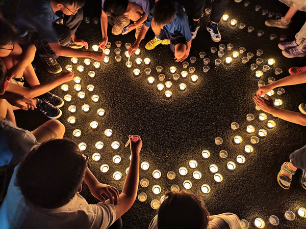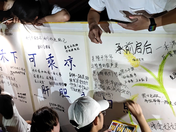 傍晚时分,送别活动准备就绪。投影幕布放映着吴孟超院士和袁隆平院士的生平事迹,操场地面上,同学们一起点燃蜡烛,伴随着志愿者深情的朗诵,同学们有序地在展板上写下对两位将一生奉献给党、奉献给祖国、奉献给世界人民的科学家的不舍与惜别。