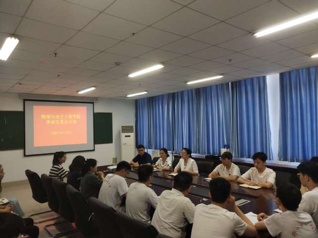 为进一步做好2021届毕业生离校工作,提高毕业生党员的党性意识,充分发挥毕业生党员的先锋模范作用,6月15日,物理与电子工程学院在四教楼510会议室召开了毕业生党员大会,团委书记周芳华、学工办副主任王伟夙及2021届全体毕业生党员参加了会议。会议由党委副书记李玲主持。