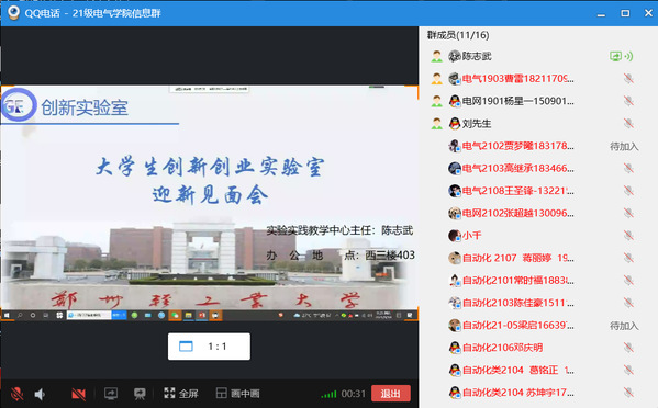 9月10日,电气信息工程学院于线上召开2021级大学生创新创业实验室迎新见面会,实验实践教学中心主任陈志武、2021级自动化类辅导员刘丰阳和全体本科新生参加了会议。