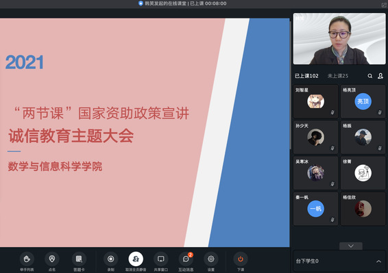 为全面宣传党和国家的学生资助政策,充分发挥资助育人功能,增强当代大学生的诚信意识和责任意识,9月10日数学与信息科学学院在线上钉钉平台召开资助知识宣讲两节课活动负责资助工作的专职教师韩笑全体2021级新生参加会议。