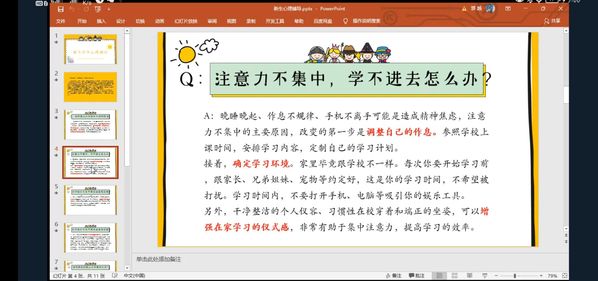班会由新生辅导员老师主持,在班会开始前,学院征集了新生常见的心理困惑,针对这些问题,辅导员、班主任和学姐学长通过一问一答的形式,以独特的思维,带领线上的同学们进行心灵的洗涤与探讨,让大家充分地感受到心理班会的魅力。在班会中,同学们逐渐加深了对彼此的了解,在交流中互相观察、学习、体验。许多同学从最初的羞涩和无助到最后彼此间真诚地交流,缓解了线上入学的不适应,进一步认识自我、探讨自我、接纳自我,调整和改善了与他人的关系。班会最后,新生辅导员老师鼓励同学们适应大学生活,做好疫情防控,保持乐观心态,通过与自我对话缓解新入学的压力。老师的建议赢得了同学们的一致认可。