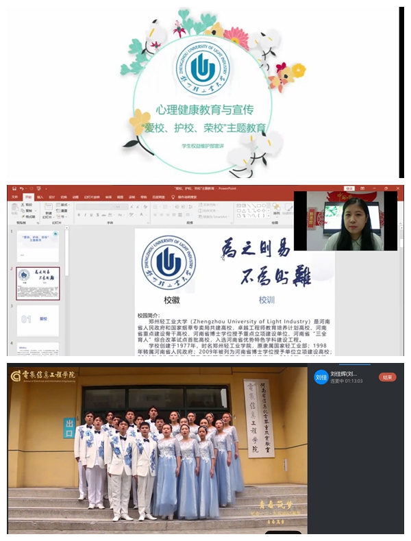 会议由心理专职辅导员芦佳老师主持,会上芦老师向新生详细讲解学校和学院的心理健康工作,包括学校及学院的心理咨询室及团辅室的设置、学校心理健康中心主要服务项目、预约方式、学校及学院心理活动的开展情况等等,让同学们深刻感受到来自学校的呵护,同时了解到心理健康的重要性及在今后遇到心理问题时如何应对。“爱校,护校,荣校”分为三个方面,通过对校规校训、学校及学院发展历程、校友荣誉、优秀学生事迹等方面的介绍,向21级新生全面展示轻大人筚路蓝缕、奋力拼搏的精神状态,活动中同学们积极参与互动,纷纷表示会用自己的实际行动为学校增光添彩。