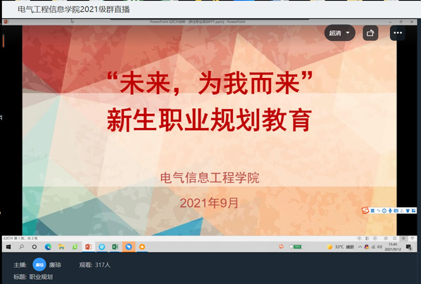 9月12日下午,电气信息工程学院以线上会议形式,组织开展了新生入学教育之职业规划教育。就业专职辅导员廉琼、2021级全体同学参加此次会议。