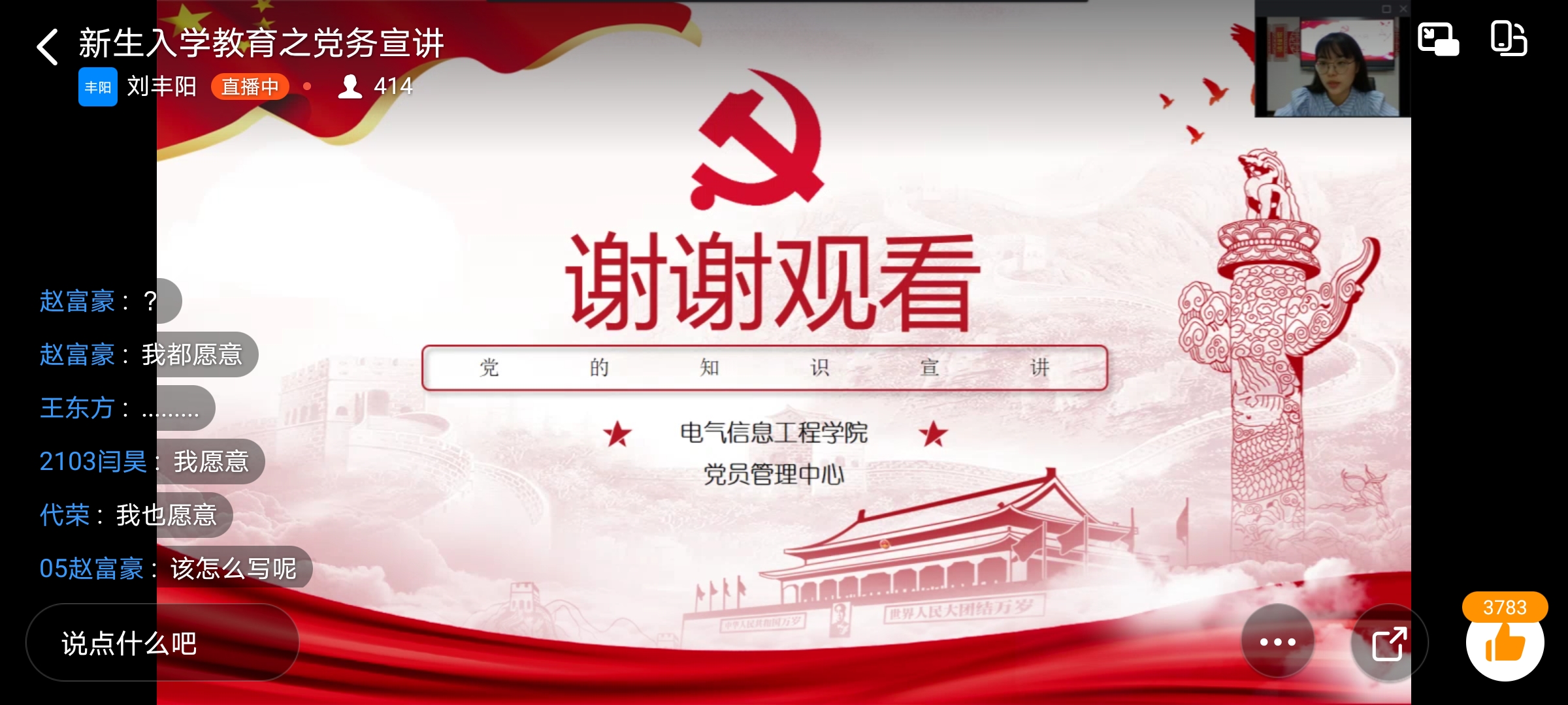 9月10日上午,电气信息工程学院组织开展2021级新生“端正入党动机,坚定理想信念”党的知识宣讲,活动以钉钉线上会议的形式进行。电气信息工程学院辅导员崔昊、党员管理中心成员和2021级全体新生参加了此次宣讲活动。