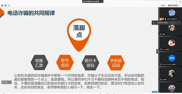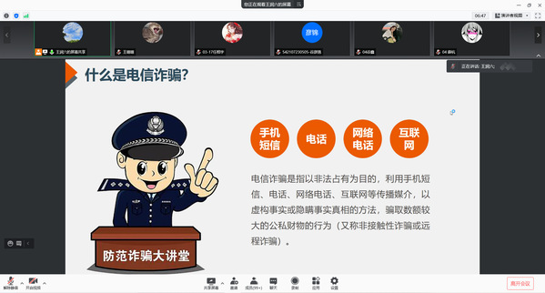 随着社会的快速发展,网络诈骗层出不穷,一些犯罪分子利用一些学生的虚荣心、贪便宜、单纯等心理特点实施各种诈骗伎俩,使部分学生遭受了巨大的财产损失和精神压力。会上,辅导员向同学们展示了什么是电信网络诈骗以及电信网络诈骗的特点,通过真实的案例对网络诈骗的方法进行详细的讲解,如犯罪分子冒充国家新政策、短信中暗藏木马链接、冒充10086等运营商客服电话、冒充银行客服骗取卡号信息等常见的方法,从这些真实的案例中总结出无论犯罪分子手法如何翻新,最后都要落到一个点上,就是要钱。因此,辅导员告诫同学们不要轻信不明对象及可疑信息,不要因贪小利而受违法短信息的诱惑,不要拨打短信息中的陌生电话,不要向陌生人汇款、转账,不要泄露个人信息,特别是银行卡信息等,一旦发现上当受骗,应当第一时间冻结银行卡并且报警。