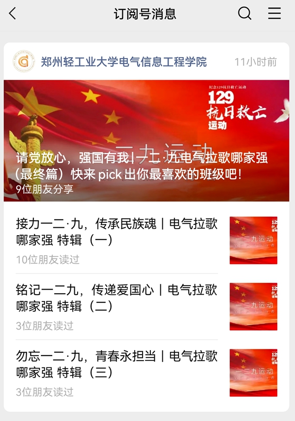 此次拉歌赛各班需要准备两首歌的视频,一首为规定曲目《我的祖国》,第二首为自选曲目,要求歌曲积极向上,充满正能量。各班级自行录制视频并分四期在“郑州轻工业大学电气信息工程学院”微信公众号上展示并开设网络投票环节,选出同学们喜爱的视频作品,结合老师对评审,评选出特等奖一名、一等奖三名、二等奖五名、三等奖六名。