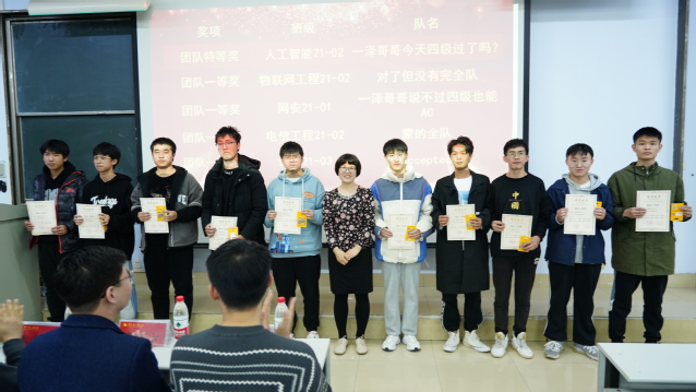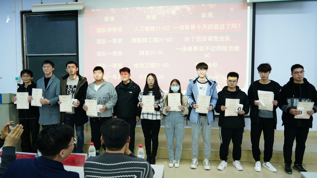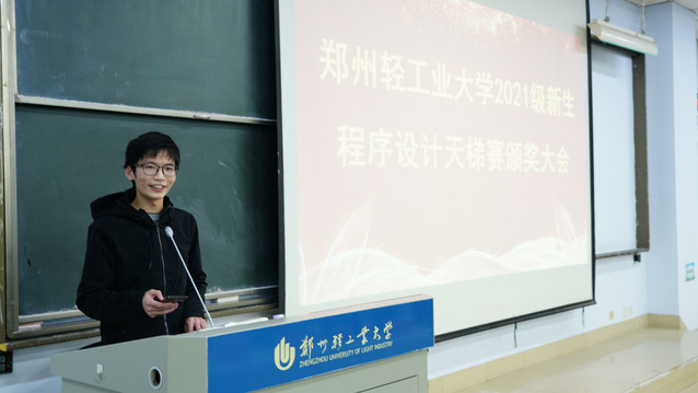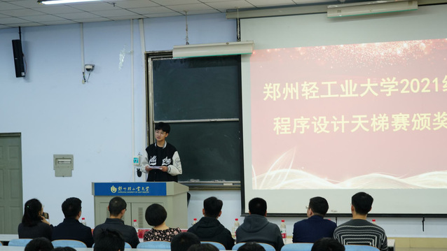 在热烈的掌声中,颁奖仪式正式开始。大赛的总负责人李晔老师做开场讲话,并为参与出题的同学颁发证书合影留念。随后,主持人依次公布了2021级C语言新生程序设计天梯赛获奖名单,与会领导老师依次为获奖队伍及个人颁发获奖证书并合影留念。随后,团队冠军队长人工智能21-2班的马恩植同学、个人冠军软件工程21-10班的郑皓阳同学分别发表获奖总结感言。在他们的发言中,可以感受到我校21级学子对程序设计的学习激情和用代码书写未来的目标信念。接下来,ACM教练朱会东老师就此次比赛成果,及新生同学表现进行讲话,鼓励各位同学打好基础,坚定方向,努力向前。最后,计算机与通信工程学院党委副书记王艳军为本次大赛做总结发言,他在祝贺同学们获得好成绩的同时,强调了学号C语言、打好程序设计基础的重要性,鼓励了21级学子自觉加强学习,不断增强本领,在实践中学真知、悟真谛。