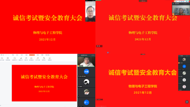 为严肃考风考纪,树立学生的诚信意识,切实做好疫情防控常态化和期末学生安全教育管理工作。近日,物理与电子工程学院分年级线上召开了诚信考试暨安全教育大会。