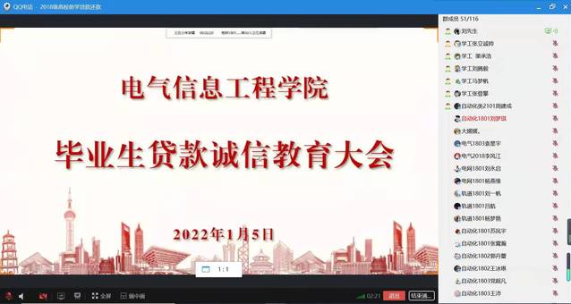 2022年1月5日下午,电气信息工程学院在线上举办2022届贷款毕业生诚信教育大会。负责资助工作的刘丰阳老师和2022届贷款毕业生参加了此次会议。