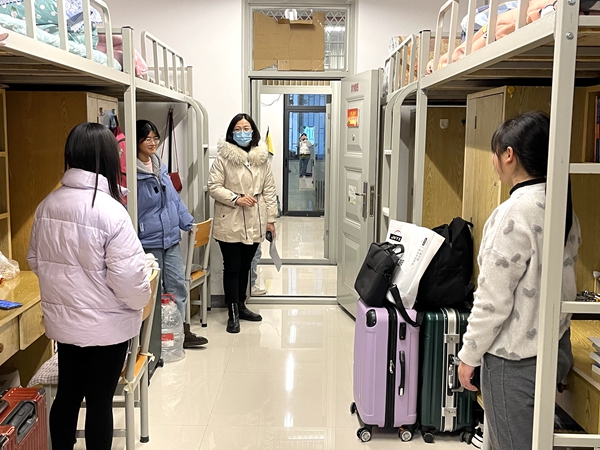 2月20日下午五点,电气信息工程学院领导班子及辅导员深入宿舍走访慰问返校学生。走访过程中,老师与同学们亲切交谈,提醒大家注意寝室卫生和用电安全,积极营造安全和谐的宿舍氛围;了解同学们寒假学习与生活情况,鼓励大家做好学业规划,奋进拼搏;同时嘱咐大家要继续加强常态化疫情防控,严格遵守学校疫情防控管理要求。通过走访,加强了同学们的安全意识,也拉近了同学们与老师之间的交流和了解。对于创建整洁文明的宿舍环境、培养和提升宿舍文化及学院的疫情防控安全稳定工作奠定坚实基础。