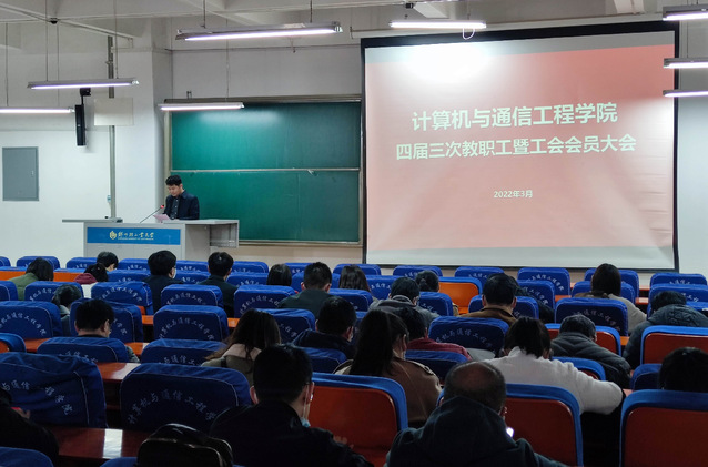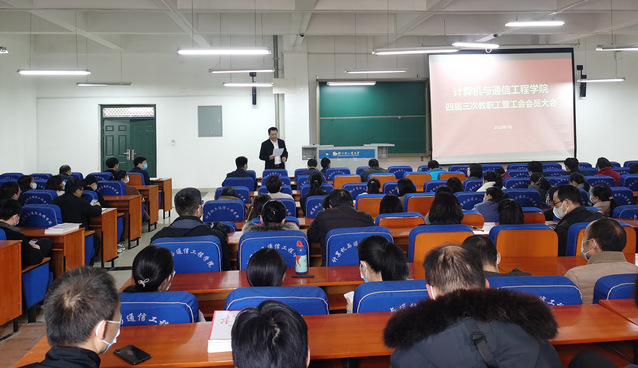 2022年3月3日下午,计算机与通信工程学院在计算机楼217召开四届三次教职工暨工会会员代表大会,全体教(工)代会代表参加了会议。会议由学院党委书记宋文军主持。