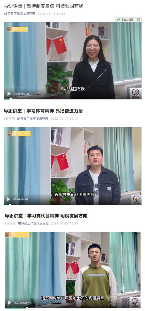 同时,学院“E语导思”辅导员工作室紧扣活动主题,推出“导思讲堂”系列视频,开展“坚持制度自信,科技强国有我”“学习体育精神,昂扬奋进力量”“学习党代会精神,明确发展方向”等思政主题教育,线上广泛推广,切实发挥网络平台开展思想政治教育的便利性和有效性,增强对学生的思想引领。