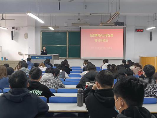 各年级辅导员分别以“勇敢拼搏·牢记嘱托”、“后疫情时代大学生的责任与担当”等主题开展主题班会活动。辅导员张智勤结合党史学习教育活动,教育学生要将人生志向转化为奋斗动力,传承发扬艰苦奋斗的“红”色基因,激活青春密码中的“红”色信仰。在疫情防控常态化背景下,不断注入奋斗拼搏的精气神,坚定脚步,强健精神,主动扛起后疫情时代的大旗,承担起大学生的历史使命。辅导员韩笑带领同学们深入学习党的十九届六中全会精神,通过回顾党的百年奋斗历程,以史为鉴,鼓励广大青年学生要牢记历史荣光、练就过硬本领、勇担强国使命、奋力拼搏前行。