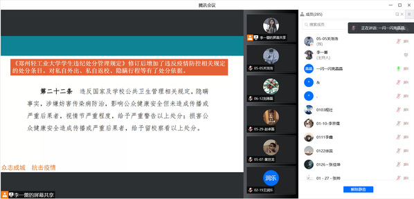 会上,辅导员老师认真带领班级同学学习了学校的相关政策文件,重点讲解“提级管理,家校同防,闭环管理”三个关键词,要求全体同学牢记校规校纪,严禁私自外出、夜不归宿;要求大家增强自我防护意识,严格落实个人防护措施,坚持每日健康申报,一旦有发热、干咳等症状及时报告;疫情防控期间做到“非必要不外出”,严格执行学生请销假流程,按要求填写报送《郑州轻工业大学疫情防控期间学生请假审批单》,外出做好防护措施;要求所有学生填写《郑州轻工业大学学生疫情防控承诺书》,做好自身疫情防控的第一责任人。同时,辅导员号召同学们,作为青年大学生,要主动带头提高防范意识,做好学业规划,加强体育锻炼,增强心理调适能力,向身边人传递积极向上的“正能量”。