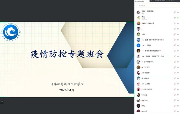 按照省委省政府、省教育厅及属地疫情防控指挥部部署安排,为进一步落实疫情防控相关要求,增强学生疫情防控意识,毫不松懈做好学院疫情防控工作,计算机与通信工程学院全体专兼职辅导员组织各班召开“增强疫情防控意识、遵守疫情防控要求、争做疫情防控模范”线上主题班会。