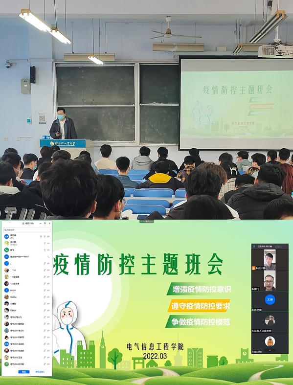 3月31日至4月1日,电气信息工程学院各年级分班级召开疫情防控主题班会,全体辅导员、班主任和学生参加,班会由辅导员或班主任主持。