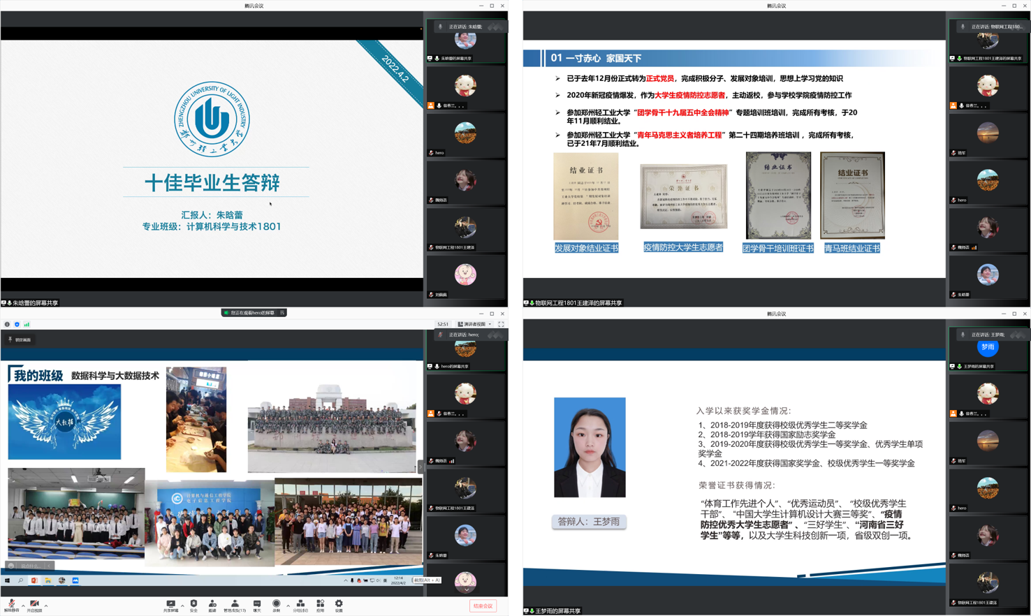 经过前期的个人申请、班级推荐、材料审核等程序,学院择优评选出符合条件的优秀毕业生参加了此次评选答辩。各位优秀学子分别从思想状况、科研学习、社会实践、志愿服务等多个方面通过PPT以及演讲的形式进行了现场展示。他们有的在学习上积极进取、目标明确,曾多次荣获省级及以上学科竞赛奖项;有的在生活中经常参加一些力所能及的志愿服务,有的在疫情期间曾去做过服务社区的志愿者。无论是在思想上、学习上还是生活中,他们都秉承轻大“为之则易、不为则难”的校训,向评委老师和同学们展示了自己在大学四年生活中取得的成绩,给自己四年的大学生活交上了一份满意的答卷。评委老师对参加答辩的同学表达了充分的肯定和赞扬,希望同学们勇于砥砺奋斗、练就过硬本领、努力成为对社会有用的人。