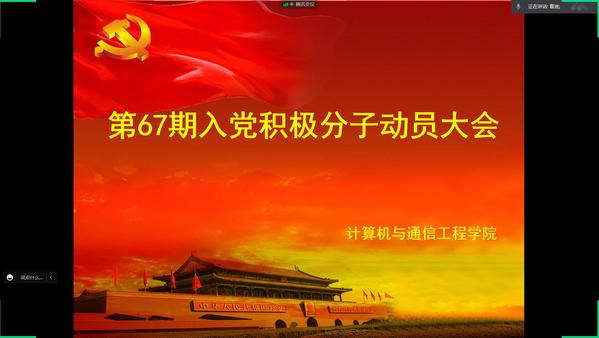 2022年3月31日,计算机与通信工程学院(电子信息工程学院)召开了第67期入党积极分子培训班线上动员大会。会议由学院组织员刘晏男主持,学院第67期入党积极分子培训班全体学员参加了会议。