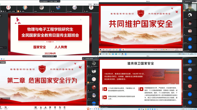 今年4月15日是第七个全民国家安全教育日。为引导学生增强国家安全意识,自觉维护国家安全,物理与电子工程学院于4月14日至15日开展了全民国家安全教育日主题班会。