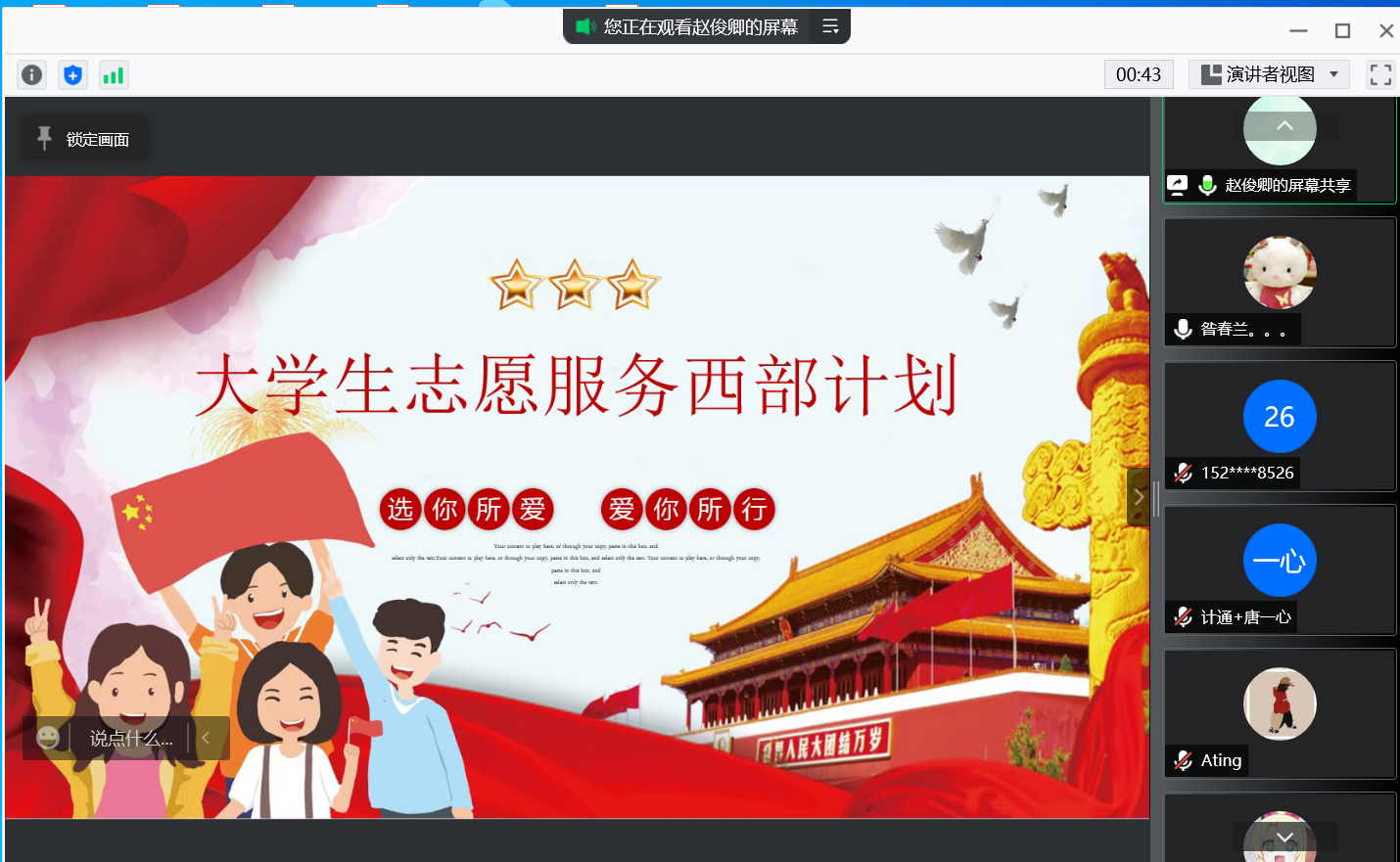 4月28日,计算机与通信工程学院通过腾讯会议召开了“大学生志愿服务西部计划”宣讲会。宣讲会由学院就业专职老师主持,往届毕业生赵俊卿和唐一心、部分毕业生参加了此次宣讲会。