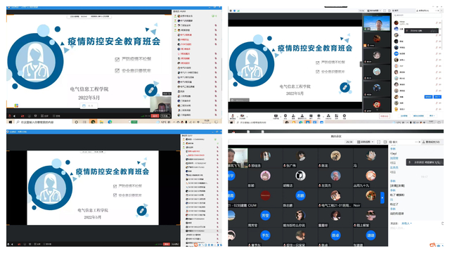 在疫情防控安全教育线上主题班会上,辅导员、班主任就近期高校大学生违反疫情防控和校园管理规定案例进行警示教育,重点就杜绝翻墙私自外出、不按要求参加核酸检测、谎报瞒报迟报等情况进行教育引导,要求各网格长精准排查信息、按要求及时上报。并进一步明确目前学院班级、宿舍楼宇“双线”管理中各级网格职责,要求同学们筑牢责任意识,高效协作、积极配合。同时,向同学们介绍了校区封闭管理期间生活服务通告内容,学校、学院将全力保障同学们封闭管理期间学习生活需求,及时为同学们排忧解困。