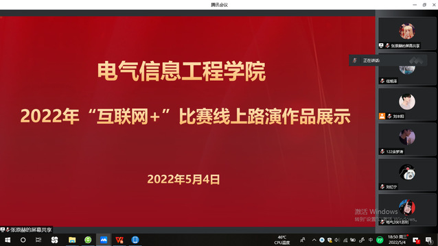 5月4日、5日,电气信息工程学院通过腾讯会议开展2022年“互联网+”大学生创新创业大赛优秀项目线上路演活动。学院副院长郑安平、实验室平台主任、各系主任担任评委,会议由副院长郑安平主持。