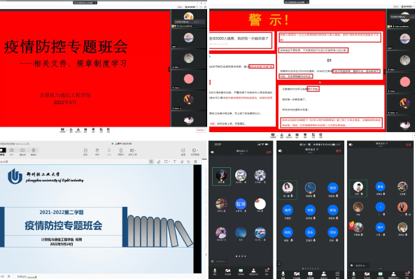 学院全体专兼职辅导员分别通过腾讯会议、微信群、QQ群等线上平台,为各班召开疫情防控警示教育专题班会。会上,首先带领学生共同学习了《郑州轻工业大学学生违纪处分管理规定》和《关于持续做好学生疫情防控工作的通知》,警示所有在校生严格遵守校规校纪。其次,结合近期部分高校学生违反防疫规定的典型案例,强调了私自翻墙出入校园、瞒报谎报行程和流调信息、未按要求参与全员核酸检测等违纪行为对校园和社会带来的风险隐患。最后,提醒同学们要深刻认识到疫情防控的严肃性和紧迫性,坚决听从、拥护和落实学校的防控指挥安排。