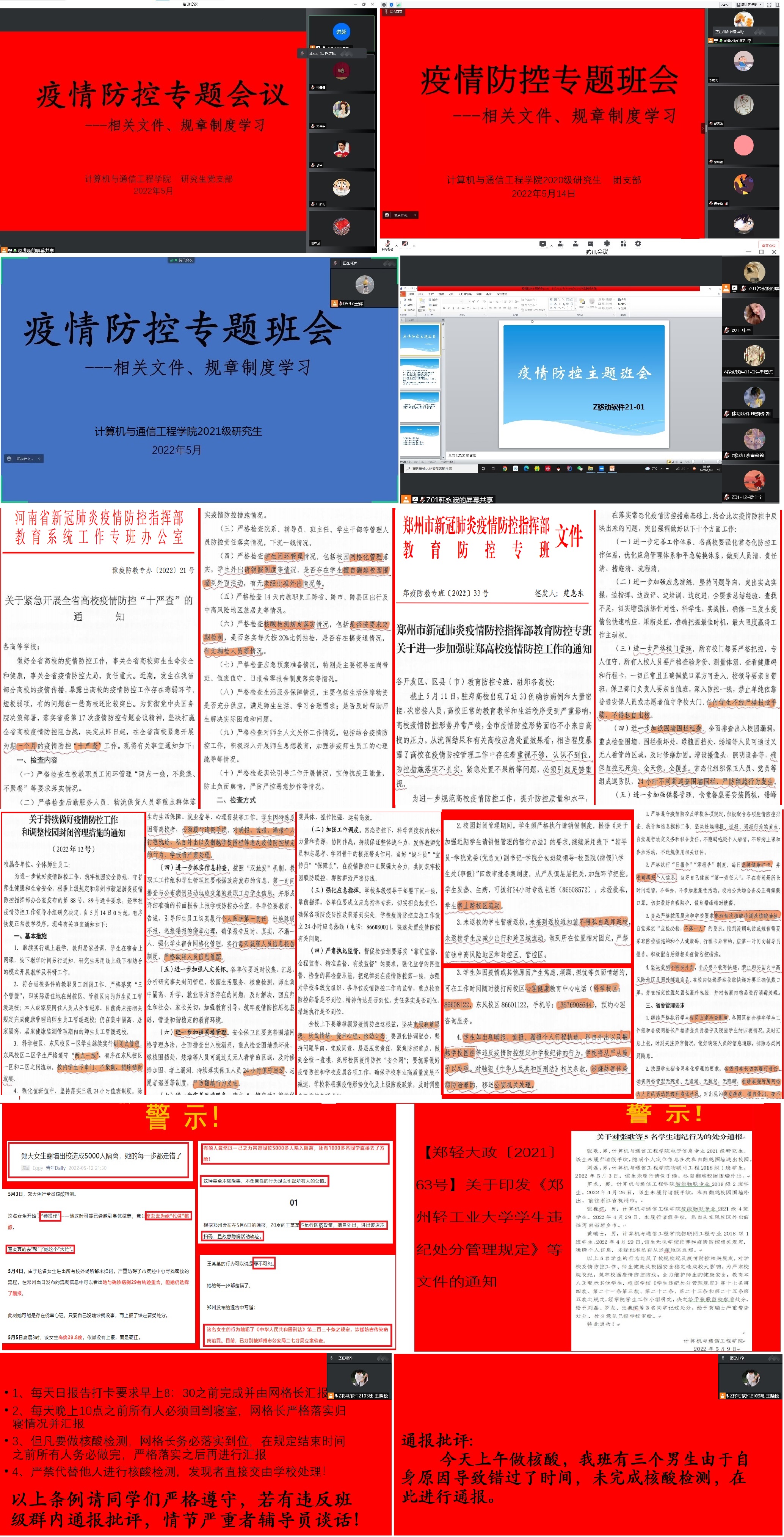 面对郑州本次突然出现的新冠肺炎疫情,全市紧急启动新冠疫情管控措施,全体轻大人也立即启动应急预案,不断加强和完善校园疫情防控措施,并取得了阶段性成果。但校园是疫情防控重地,并且社会层面疫情形势仍然不容乐观,郑州市仍有零星病例出现,计算机与通信工程学院坚决贯彻落实学校疫情防控工作部署,团结一心,不断强化、细化网格化管理。分别在研究生各党支部、班级团支部、各年级中组织召开党员、各级网格长等不同范围、不同层次的学习会议,再次学习违反高校疫情防控管理规定的处理案例,分析这些案例对相关校园师生健康和正常生活、教学秩序造成的影响和严重后果,对全体学生进行再警示。