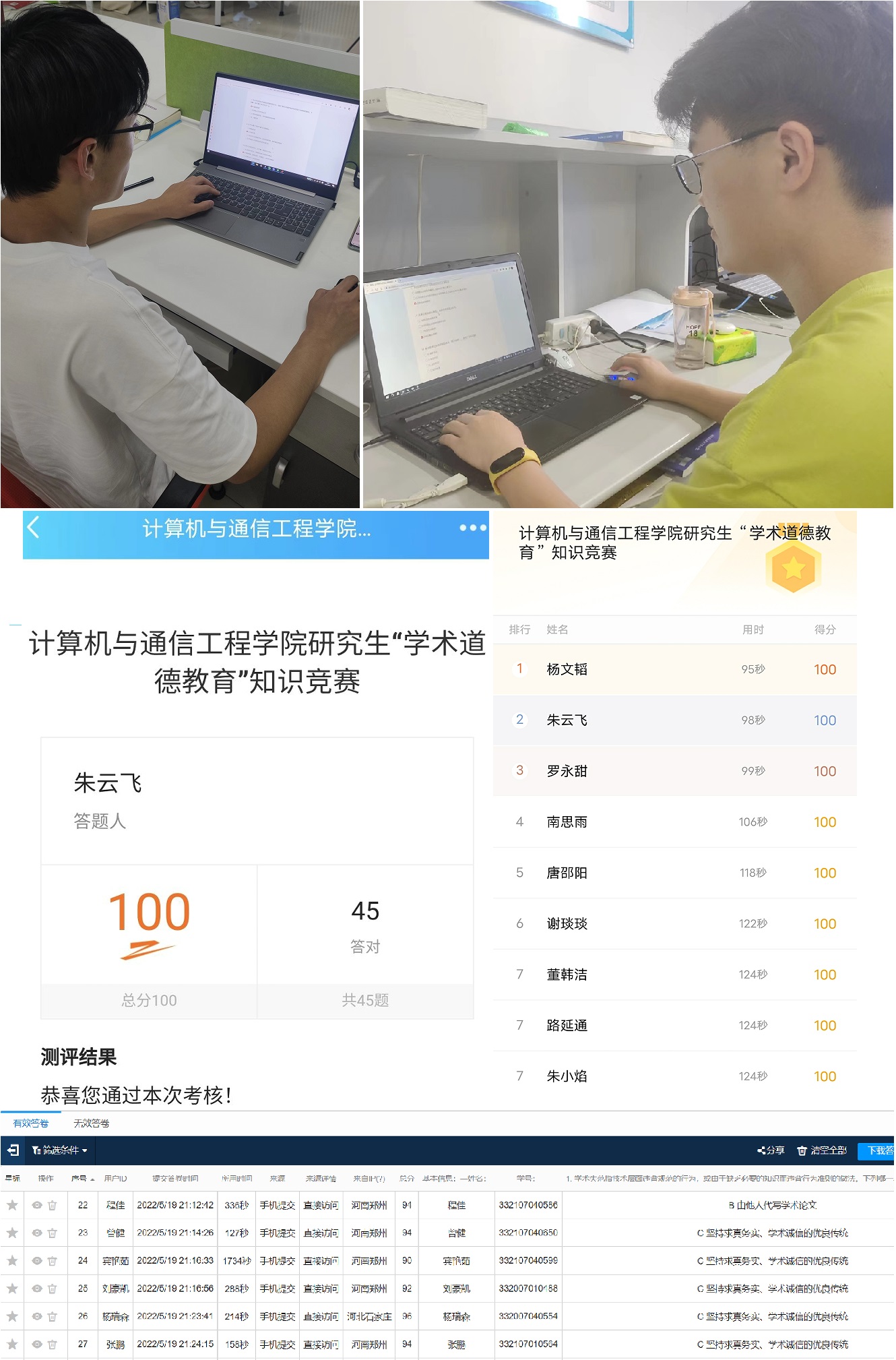 为深入贯彻落实《关于进一步加强科研诚信建设的若干意见》的精神,此次活动以“弘扬学术精神,恪守学术道德”为主题,并结合学科评估的要求,积极推进我校研究生科学道德与学风建设,营造风清正气、求真务实的学术氛围。竞赛采用线上答题模式,围绕科研诚信与学术规范精选题目,通过单项选择、多项选择、判断题等多种题型展现给大家。同学们踊跃参加,在规定时间内完成学术道德相关题目,最终以作答正确率及用时进行综合排名。根据结束时的答题情况,平均分在90分以上,并有许多同学获得了满分的好成绩。