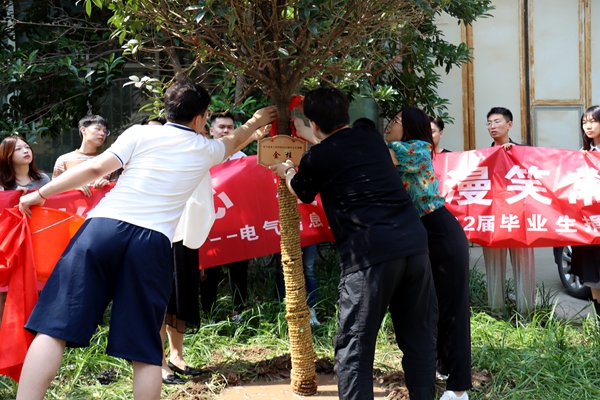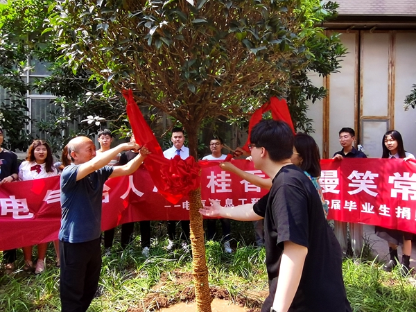 学子们在离校之际亲手在电气信息工程学院楼前种下一棵金桂,老师和同学们一起为桂花树培土浇水。