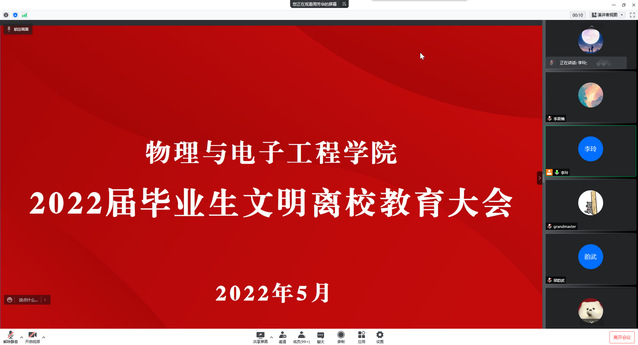 5月25日下午,物理与电子工程学院线上召开了2022届毕业生文明离校教育大会。学院党委副书记李玲、就业工作专职辅导员王伟夙,全体2022届毕业生参加了会议。