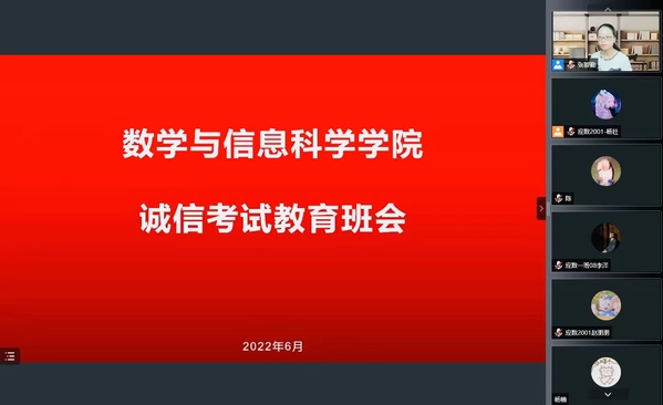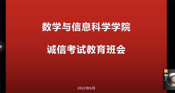 期末考试临近,为进一步加强考风考纪教育,增强学生的纪律意识、诚信意识,深入推进学院学风建设,近日,数学与信息科学学院通过线上会议形式分年级召开了诚信考试教育大会。
