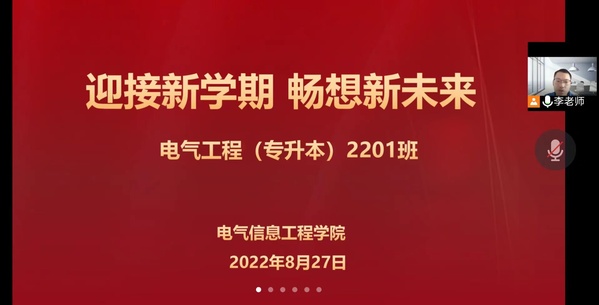 8月27日下午,电气信息工程学院召开“迎接新学期 畅想新未来”2022级电气工程专业专升本新生线上见面会,新生辅导员、班主任和全体电气工程专业专升本新生参加了此次见面会。