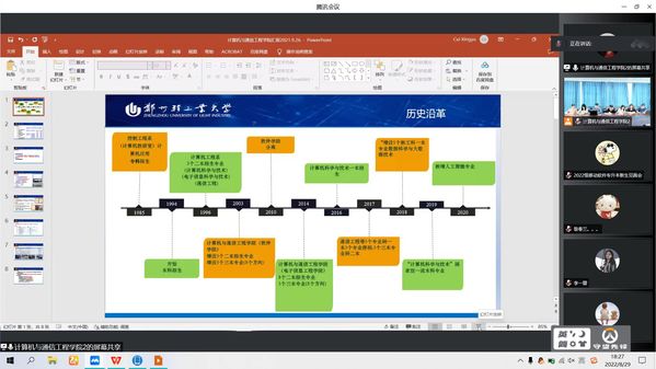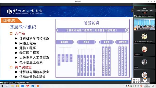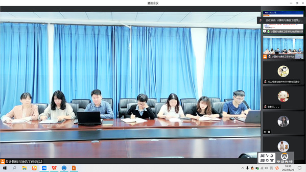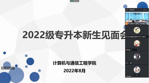 8月29日下午,计算机与通信工程学院召开2022级专升本新生线上见面会,学院党委副书记王艳军、副院长邓璐娟、团委书记孟牒、专职辅导员及全体2022级专升本新生参加了此次见面会。会议由学工办副主任李一蕾主持。
